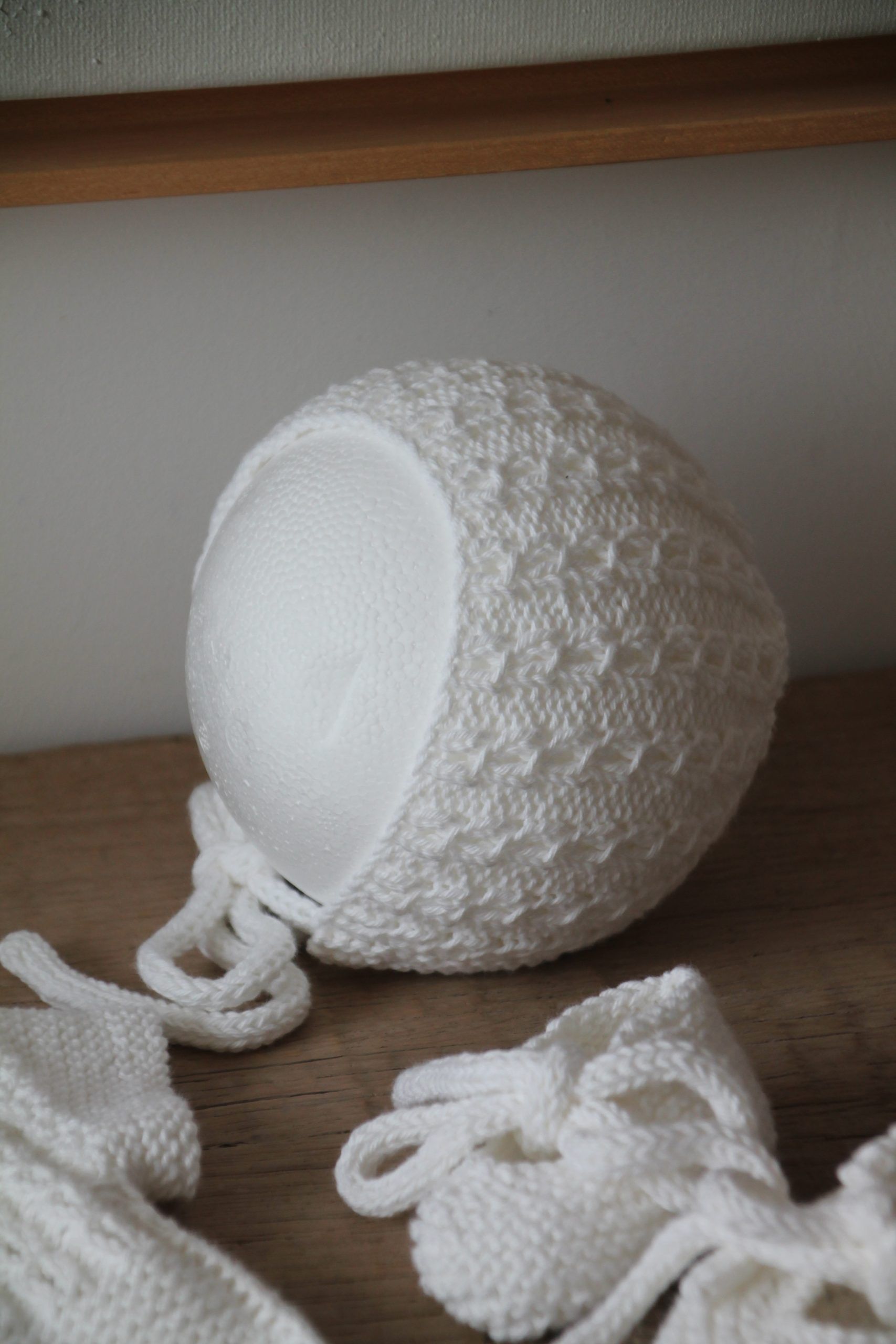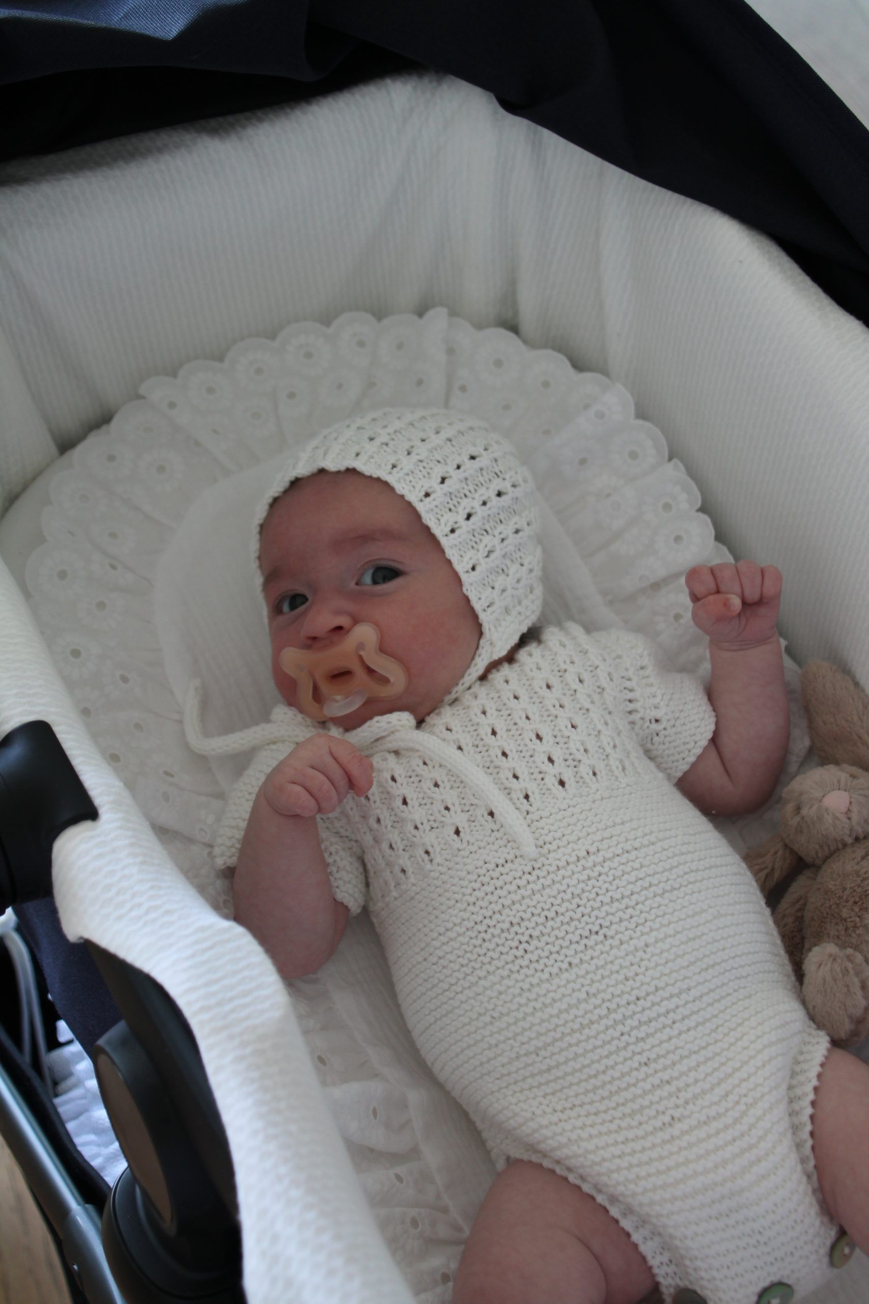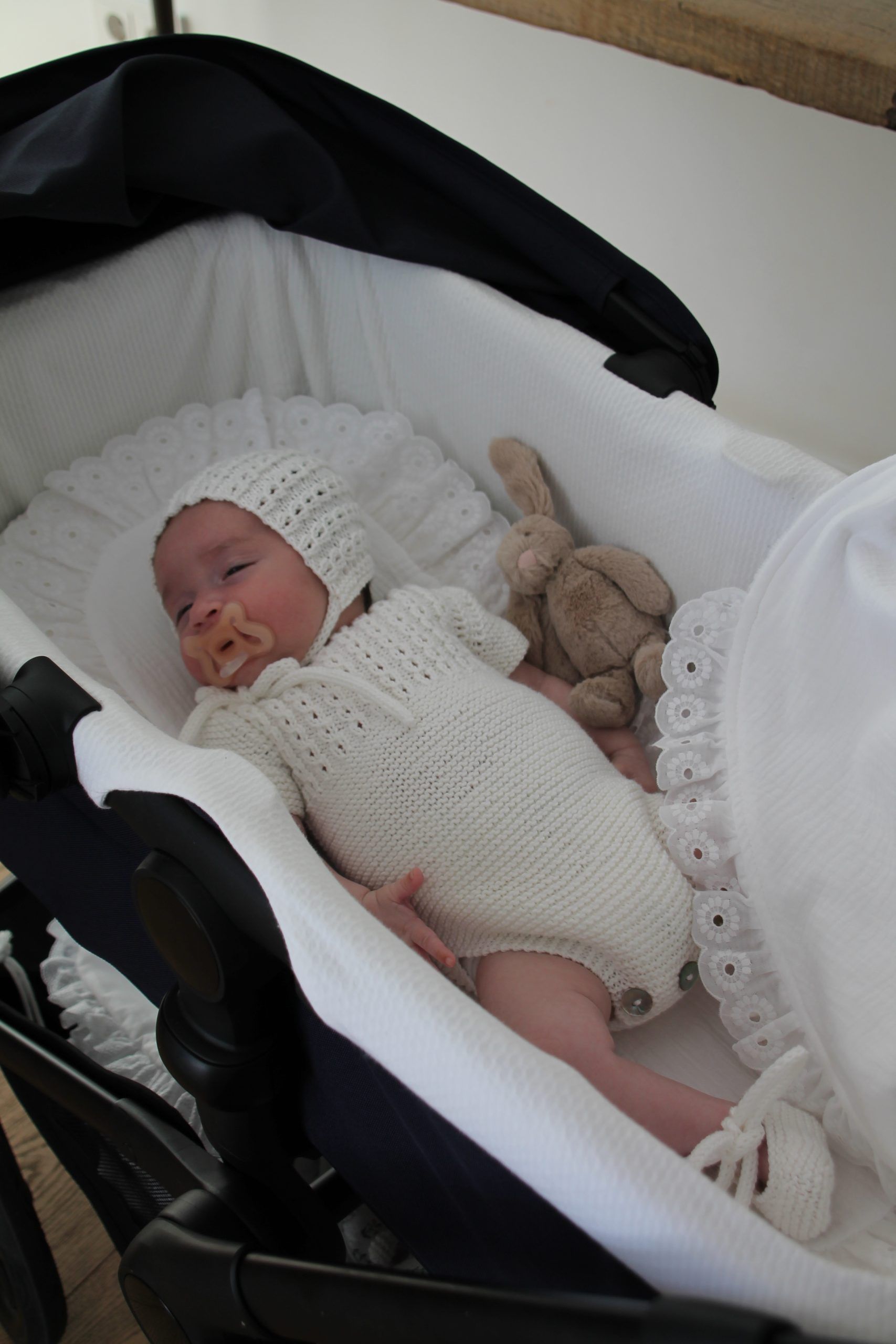 Este delicado pack incluye un pelele, una capota y unas bailarinas de punto, cuidadosamente tejidos a mano en algodón de alta calidad. Su diseño clásico y atemporal lo convierte en una opción perfecta para cualquier ocasión o como regalo inolvidable para recién nacidos.