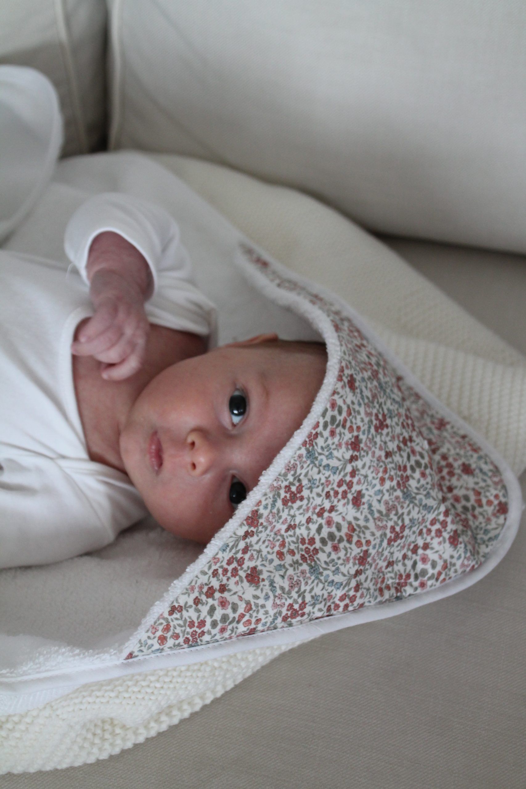 Nuestra toalla capa para recién nacido de algodón tiene un tacto extra suave y es ideal para los primeros meses del bebé.